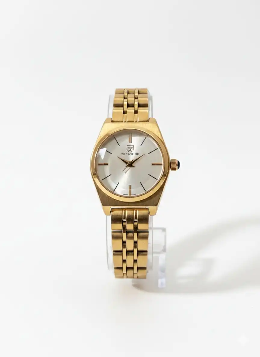 The Ashnaa Golden Treasure is a celebration of timeless vintage design. This elegant timepiece features a radiant champagne sunburst dial housed in a slim, brushed gold-tone case. The minimalist linear hour markers and sleek hands maintain a clean, sophisticated look. One of its standout features is the faceted glass crystal that adds a unique diamond-like shimmer when it catches the light. Paired with a classic five-link gold stainless steel bracelet, this watch offers a comfortable yet luxurious feel. It is the perfect accessory for the woman who values classic style and understated wealth.