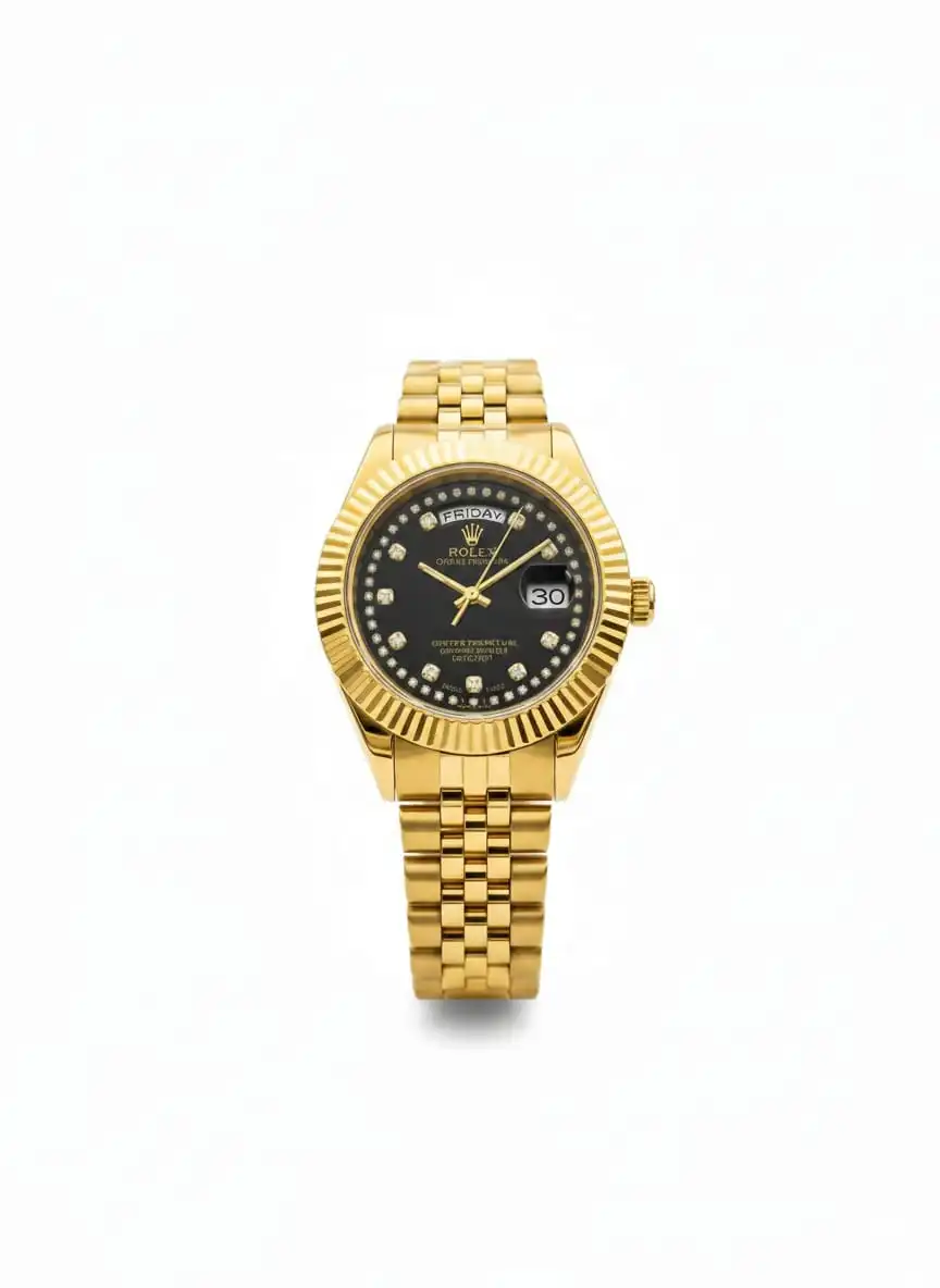 Dial: Lustrous black dial featuring crystal “diamond” markers and a full day-of-the-week display at 12 o’clock.