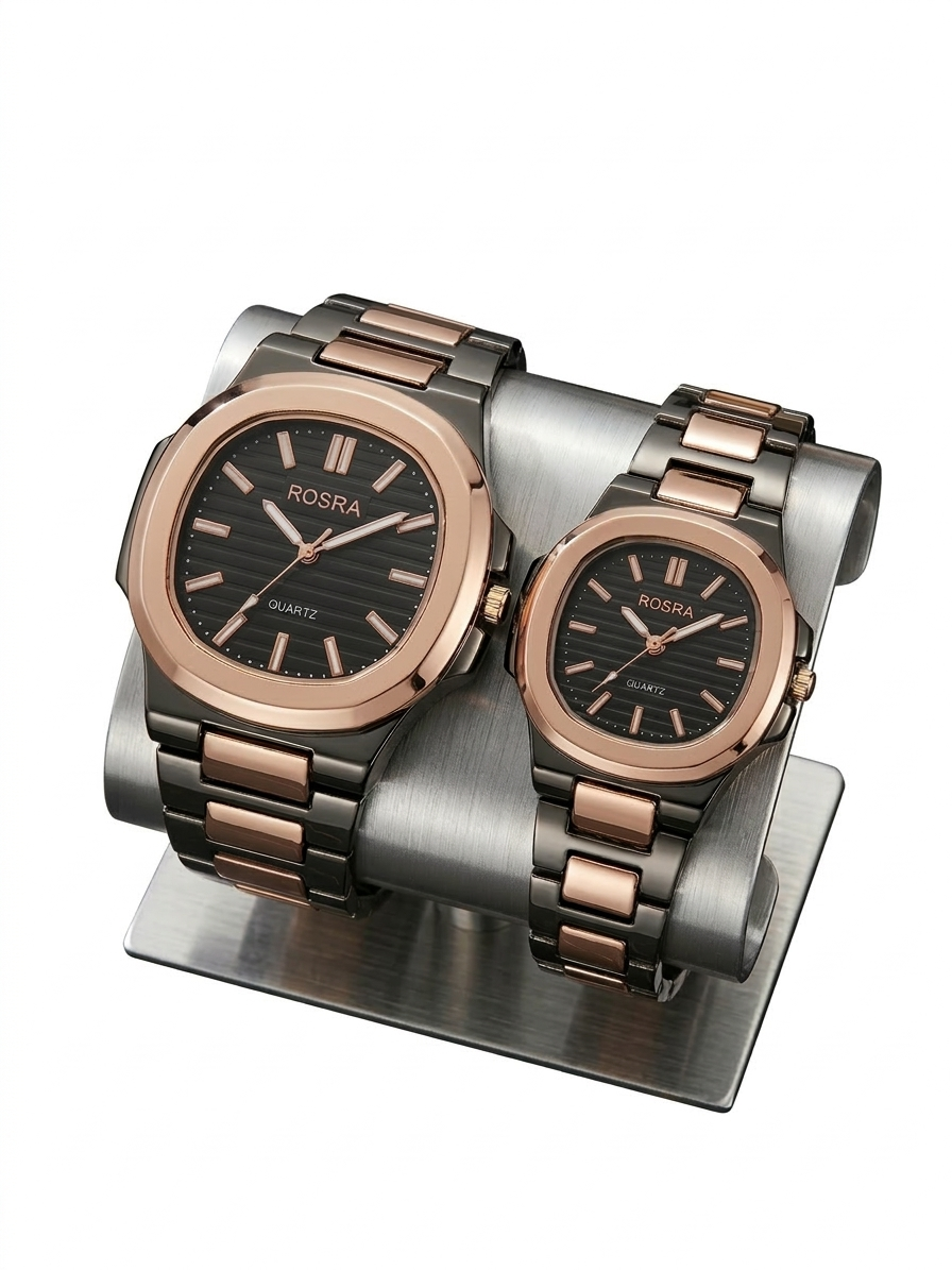 Define your relationship with the sophisticated Ashnaa Rosé Harmony set. This collection features a stunning brushed rose gold bezel that offers a softer, more romantic glow than traditional gold. The dial is a deep, “Midnight Black” with a subtle horizontal linear texture that adds a premium feel to the face. The rose gold-tone markers are treated with a high-polish finish to ensure they catch the light beautifully. Both watches come with an integrated graphite-grey and rose gold bracelet, providing a modern, industrial-chic look that suits both masculine and feminine styles perfectly. It is the ultimate statement piece for couples who value modern luxury.